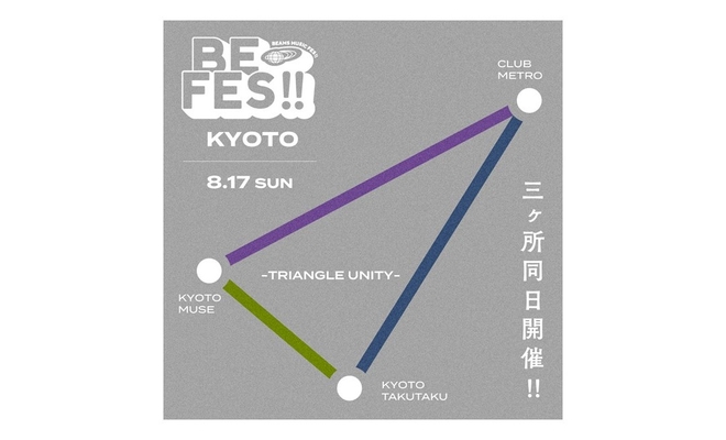 「BE FES!! KYOTO」が京都の街を舞台に、京都 磔磔、KYOTO MUSE、CLUB METROという3つのライブハウスが三角形のように結びつき、音楽を通してお客様とビームスと街全体が一体となることで、新たなコミュニティ形成に繋げたいという想いが、「TRIANGLE UNITY」に込められている。