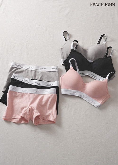「PJ BASIC」は、飽きのこないシンプルさを追求し、いつ着けても自然体でいられることをテーマにしたニュートラルなノンワイヤーブラやインナー等をラインナップし、幅広い世代の日常に溶け込む価格帯で展開。なかでも人気の、ロゴ入りゴムがデザインポイントのシリーズから新デザインが登場し、バックホックタイプのブラやボクサーパンツ、ジョガーパンツ、Tシャツが新たにラインナップに加わった。