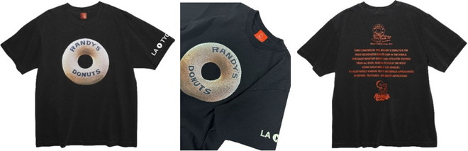 東京1号店限定Tシャツは、ロサンゼルスの1号店の屋根上にそびえ立つ巨大なドーナツ型サイン看板を大胆にプリントしたセレクトショップ「フリークスストア(FREAK’S STORE)」の企画・デザインの限定Tシャツだ。バックにはランディーズドーナツの説明、左袖にはLA→TYOをデザインしている。