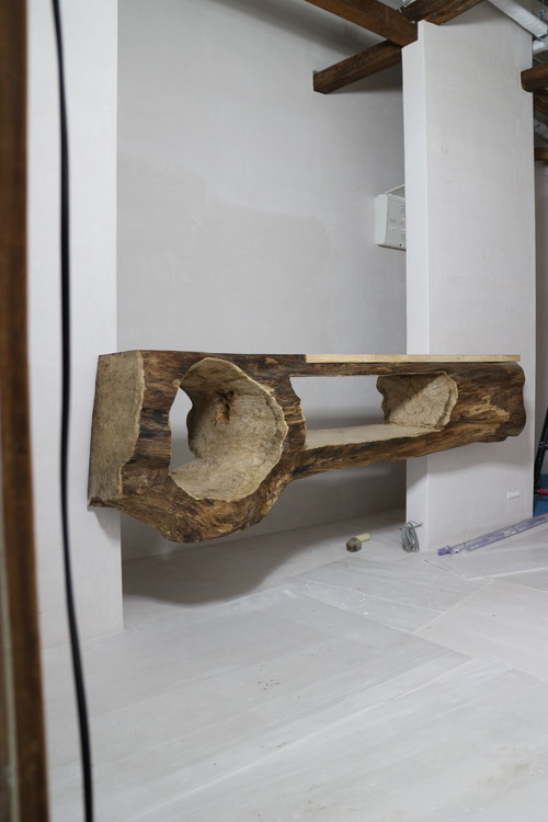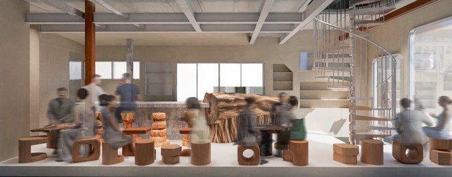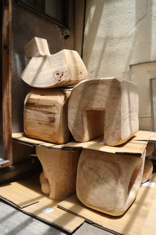 壁際には、高知県産の大木を加工したオリジナルスツールが並ぶ。チェーンソーで一つずつ成形し、移動型にすることにより、この空間での自由度を上げた。最大で15席弱あり、カウンターで一人飯やしっぽり呑むのも良し、スツールを自由に移動して座ることも可能だ。