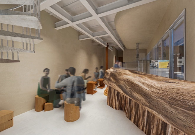 入って右手には高知県産の大木カウンターを設置。奥のカウンターは、東京・荒川区に制作場を構える・大橋左官のコーヒー豆を混ぜ込んだ左官で制作されている。当初は最奥に階段があったが、導線を再考し、入口左手に2Fへと繋がる螺旋階段を設置した。
