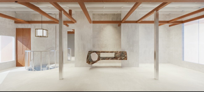 螺旋階段を上り2階へ行くと、左官と塗装のみで仕上がったホワイトキューブ空間が広がる。中央には1階同様に大木カウンターを設置し、こちらは〇□にくり抜いている。試着室の建具は、1階の取手を制作してた盛永省治が担当した。壁側L字に洋服が並び、1Fでアルコールを注文し、2Fで呑みながら洋服などを見ることが可能だ。多目的空間として時には展示、POPUPなども開催していく予定である。