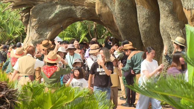 霧が晴れると、41名のジャングリア ナビゲーターたちが勢ぞろいして登場し、来場者を出迎え、祝祭ムードが一気に会場を包み込んだ。来場者からは拍手と歓声が沸き上がり、まさに冒険の幕が切って振り落とされた。順々に、来場者が入場していくと、その先には、約200名のナビゲーターたちが、グランドオープンを祝して、満面の笑顔と、大きな歓声の中、ハイタッチをしたり、手を振ったりしながら来場者を出迎えた。