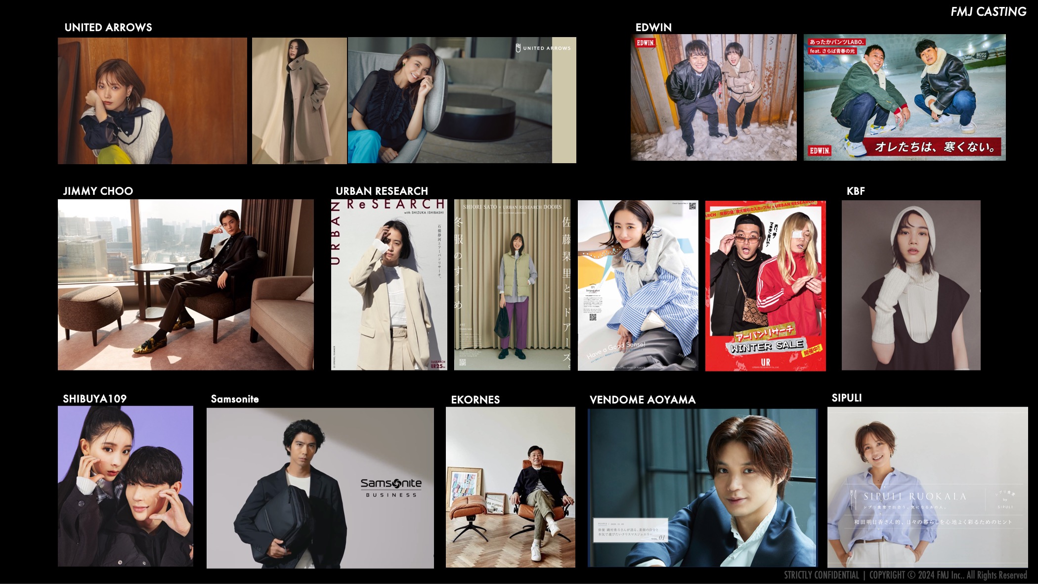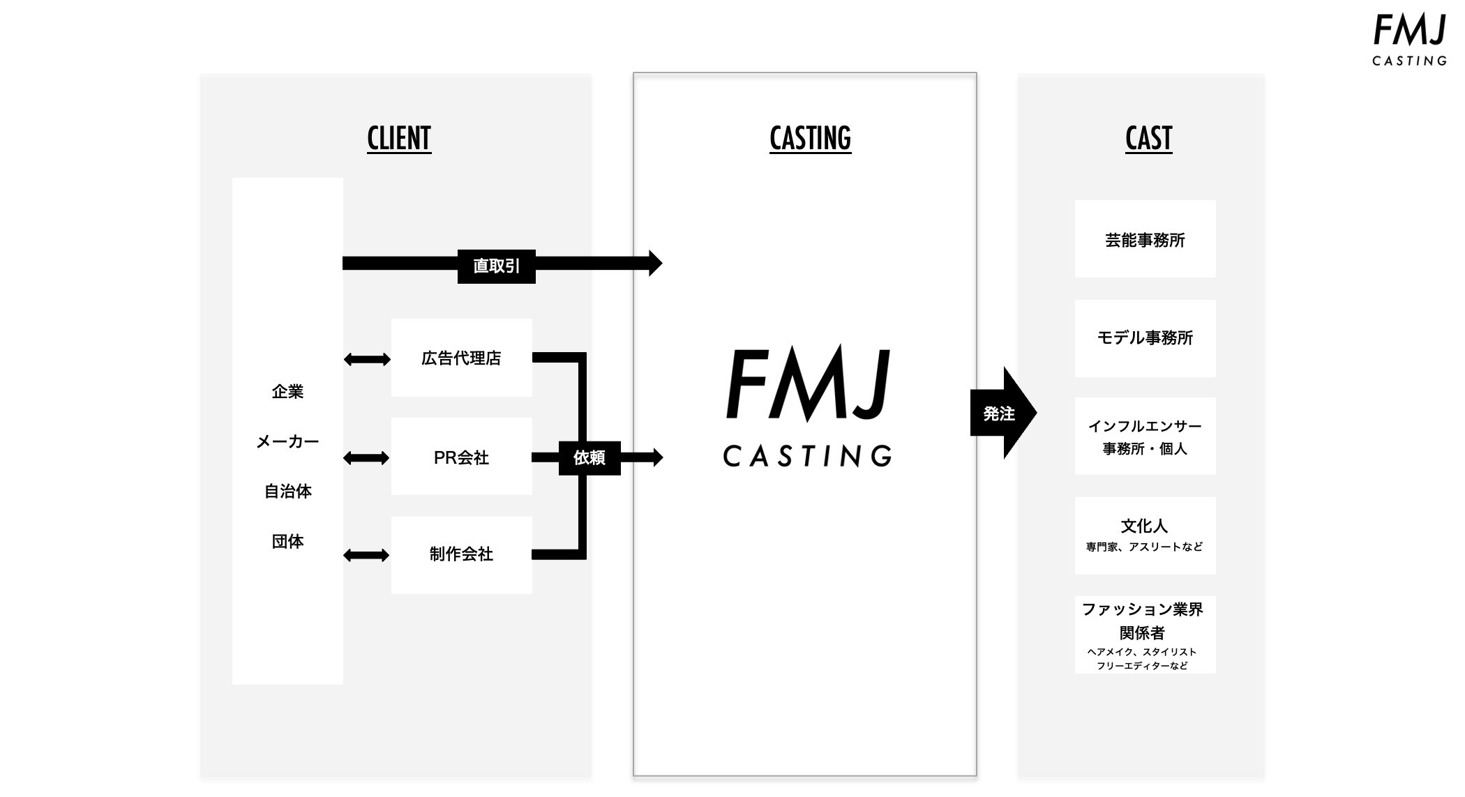 キャスティングには、専門的な交渉や契約、綿密な進行管理が必要となります。ファッションWEBメディアである私たちは、芸能事務所からの売り込み、タレントが出演する作品、出版物のニュースリリースを多くいただきます。それにより、芸能事務所やエンタメ関係とのネットワークを構築しております。また、制作プロダクションという立場もあるため、タレントやブランドが起用してほしいスタイリストやフォトグラファーとのつながりもあり、双方にとって価値のあるクリエイティブを提供できるという安心感があります。さらに、WEBメディアだからこそ、フォロワー数や過去データなどから算出する単なるタレントパワーではなく、ファッションマーケットに特化した注目のタレントなど、旬のキャスティングができる専門性があります。ぜひ、ファッションメディアxプロダクションだからこそできる総合キャスティングサービス「FMJ CASTING」をご活用くださいませ。